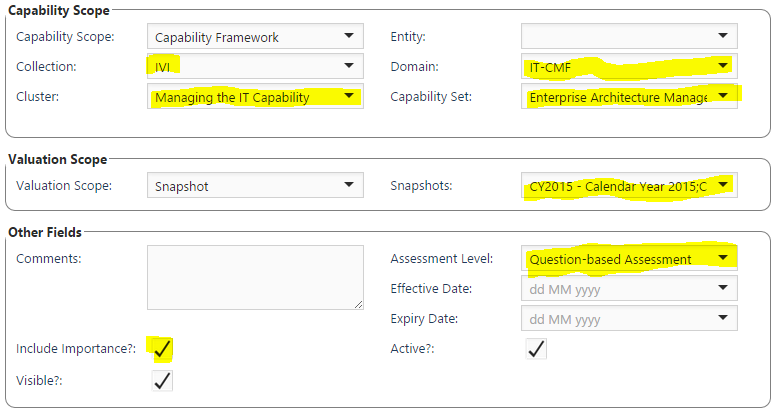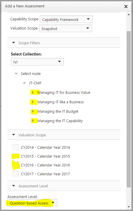 For IT-CMF Critical Capability Assessment, make sure you are using IVI in collection field. Select IT-CMF in the domain field. Pick the macro capability from the cluster drop-down list. It will update the list of critical capabilities in the capability set drop-down. Select the critical capability. For other capability assessments, navigate through appropriate collection, domain, cluster or directly pick a capability set from the dropdown list.