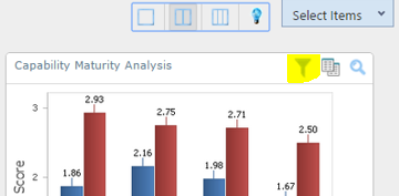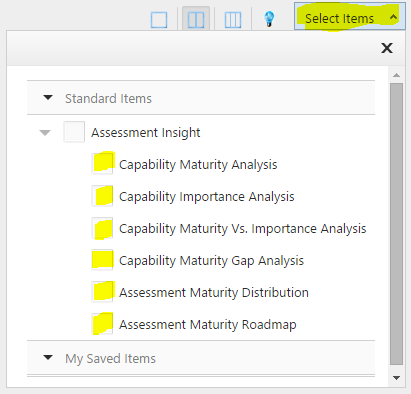 Select ANALYTICS from INSIGHT menu. The charts under Capability Model Analysis allow you to visualize and analyze the latest maturity data for a capability. The charts under Assessment Insight allow you to analyze the data for a particular assessment.