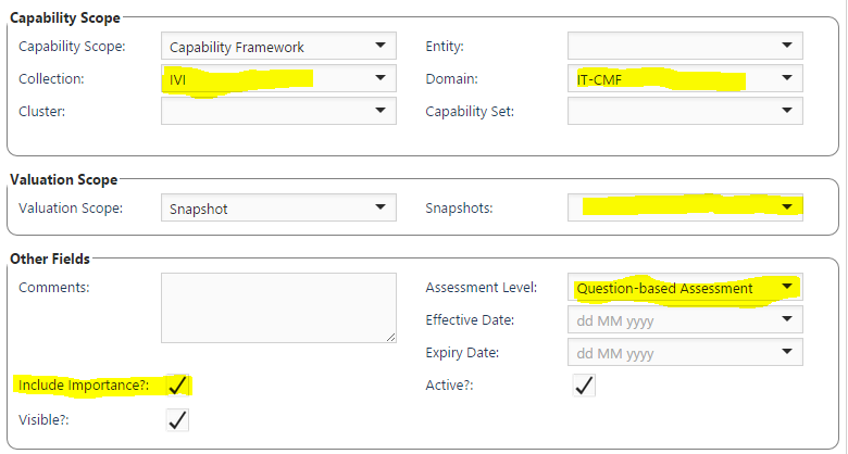 Other Fields Pick Question-level assessment in the Assessment Level field. If you want to ask participants about the relative importance of various questions or capabilities, mark “Include Importance” checkbox.