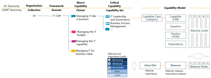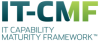 IT-CMF content is organized into a simple hierarchy with 35 critical capabilities (CCs) in 4 macro capabilities. Each critical capability consists of one or more categories. Each category consists of one or more capability building blocks (CBBs). Each CBB is described along a maturity scale of 1 to 5. A CBB have one or more questions. Each question has a response for each level of maturity. A CBB may have one or more practices for achieving a level of maturity. In addition of a description, the practice also includes associated outcome and metrics. The content also includes dependencies between critical capabilities. From a perspective of a specific critical capability, the dependencies can either be input dependencies or output dependencies.